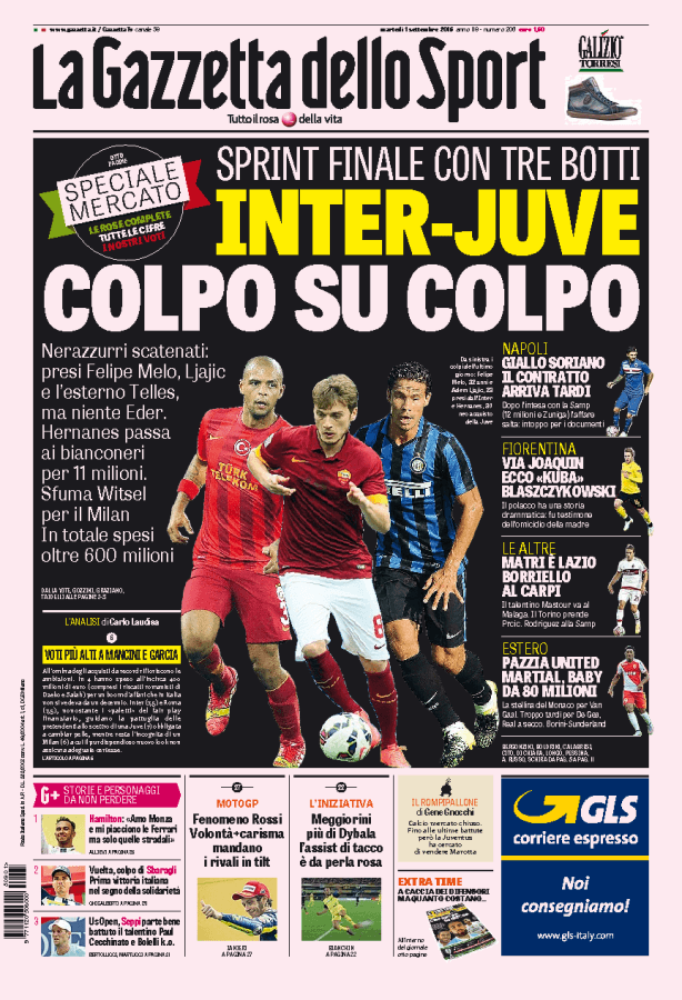 La Gazzetta dello Sport parla di Inter e Juventus che hanno infiammato l’ultimo giorno di calciomercato.