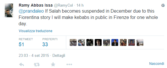 Continua la telenovela Salah. L’agente dell’egiziano, Ramy Abbas, ha risposto su Twitter a un tifoso con la seguente affermazione: ‘Se Salah sarà sospeso a dicembre per la vicenda con la Fiorentina io farò kebab in pubblico a Firenze per un giorno intero‘. Ricordiamo che la Roma ha ricevuto il transfer provvisorio dalla FIFA per far giocare Salah ma deve ancora aspettare quello definitivo: la pronuncia definitiva arriverà a dicembre. Intanto continua la guerra a distanza tra l’entourage del giocatore e la Fiorentina.