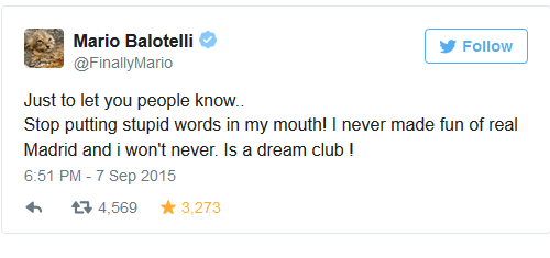Dopo tale notizia, Mario Balotelli è tornato a difendersi su Twitter: “Smettetela di mettermi in bocca parole stupide. Non ho mai preso in giro il Real Madrid e non lo farò mai. E’ un club da sogno”.