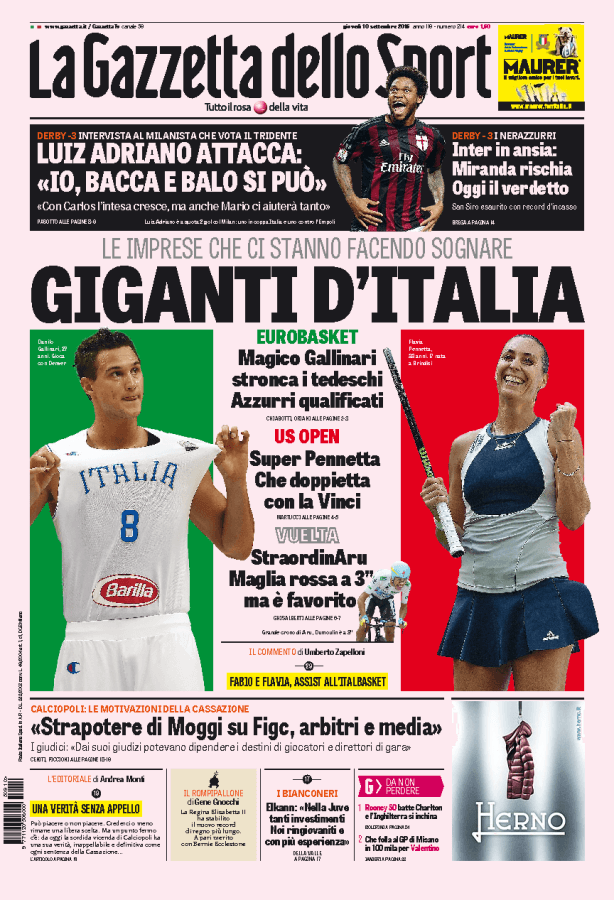 La Gazzetta dello Sport elogia l’Italbasket che batte la Germania e si qualificano. Ma è anche la giornata di Pennetta e Vinci che volano in semifinale agli Us Open.