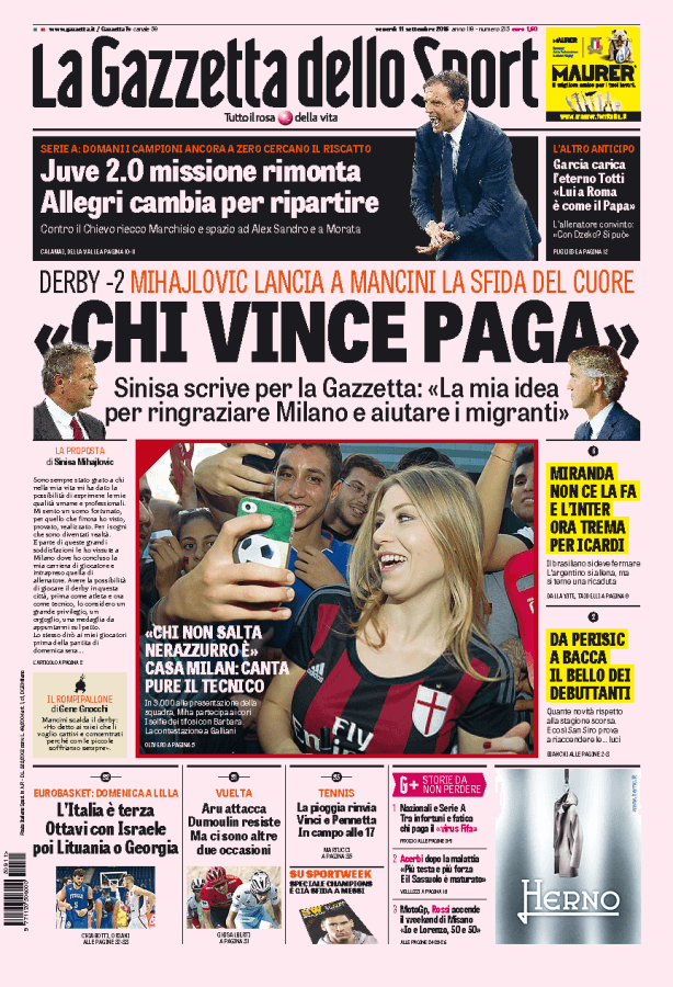 La proposta di Sinisa Mihajlovic a due giorni dal derby. Chi vincerà dovrà aiutare i migranti che arrivano da tutto il Mondo.