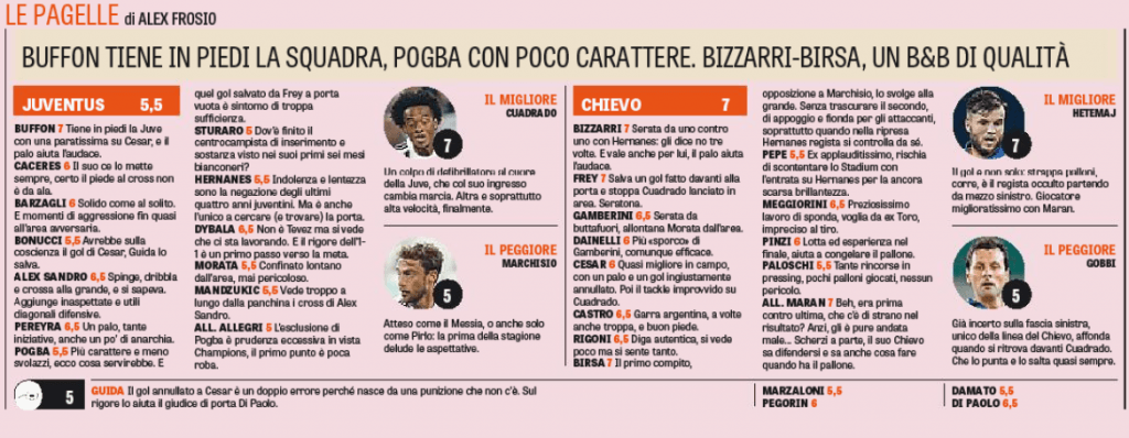 Che fine ha fatto la vera Juventus? E’ quello che si chiedono i tifosi bianconeri che, dopo tre giornate, non hanno ancora visto la squadra che ha dominato il calcio italiano negli ultimi anni. Allo Stadium, contro il Chievo, la squadra di Allegri ha raccolto solo un punto in un match vivacizzato dall’ingresso di Cuadrado, in assoluto il migliore nei voti della Gazzetta dello Sport. Nel Chievo, invece, il voto più alto va a Hetemaj.