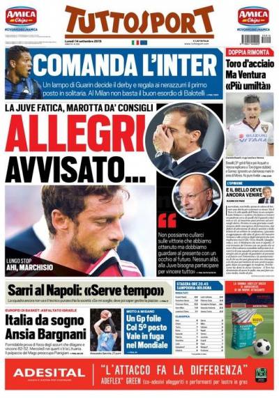 Su Tuttosport si parla di Allegri che deve ritrovare la Juventus. Il messaggio di Marotta e l’infortunio di Marchisio.