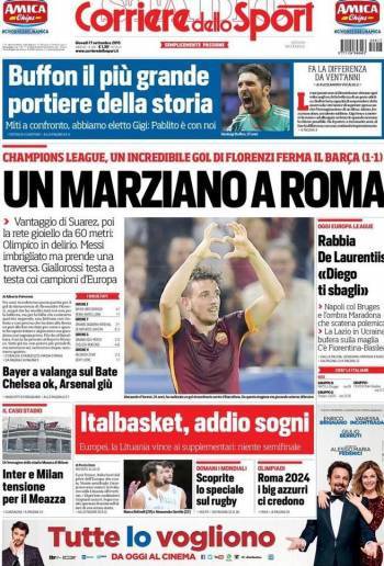Il Corriere dello Sport parla di Florenzi definito un marziano dopo il grandissimo gol da centrocampo contro il Barcellona.