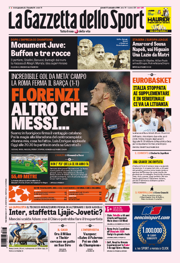 La Roma pareggia uno a uno contro il Barcellona grazie al super gol da centrocampo di Alessandro Florenzi.