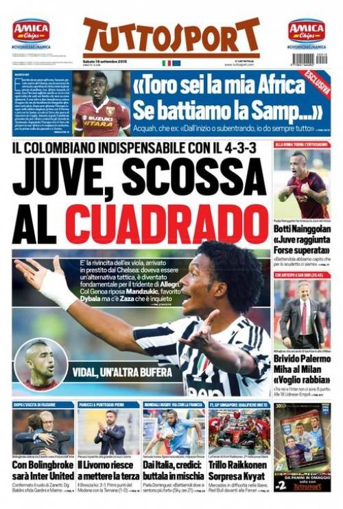 Su Tuttosport si parla di Cuadrado diventato ormai indispensabile per il modulo 4-3-3 della Juventus di Allegri.