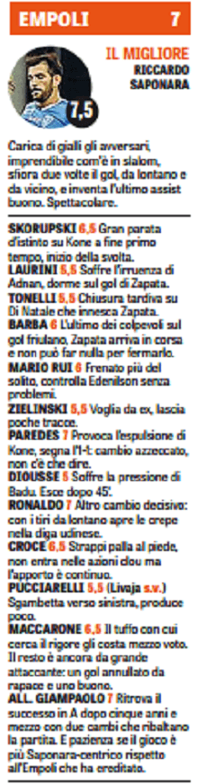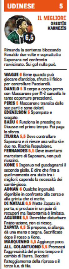 Udinese in crisi, sorriso per l’Empoli. E’ questo il verdetto dell’anticipo della quarta giornata di Serie A. La squadra di Colantuono non sa più vincere dopo aver battuto la Juventus. Nelle pagelle della Gazzetta dello Sport il migliore è il protiere Kernezis che rimanda il ko per ben due volte. Molto meglio l’Empoli che trova la prima vittoria stagionale e soprattutto un prezioso Saponara, il migliore dei suoi.