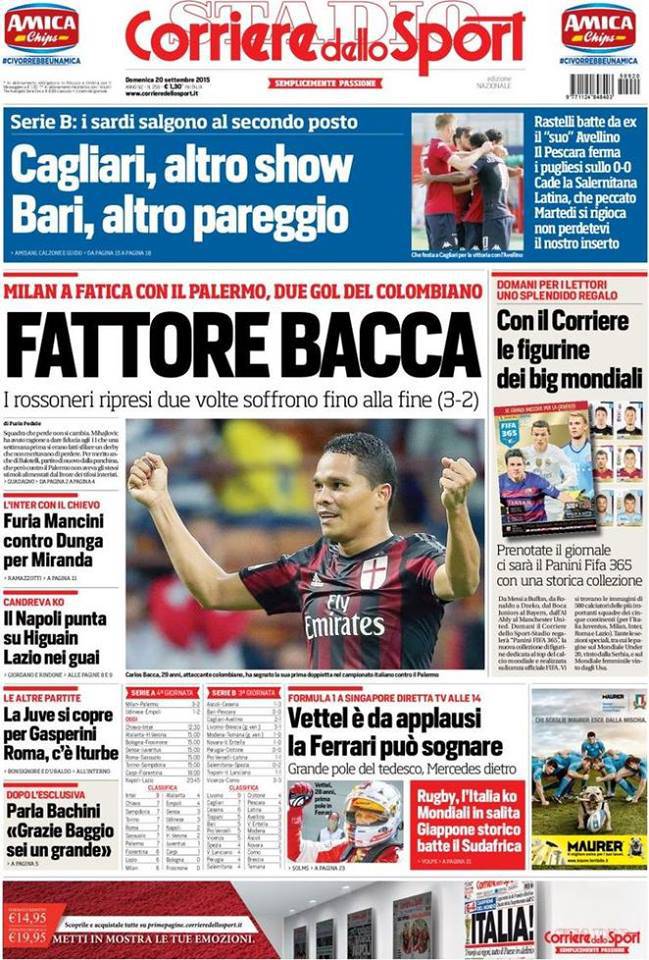 Milan a fatica con il Palermo, due gol del colombiano. I rossoneri ripresi due volte, soffrono fino alla fine. Furia Mancini contro Dunga per Miranda. Il Napoli punta su Higuain, Lazio nei guai. La Juve si copre per Gasperini. Roma, c’è Iturbe.