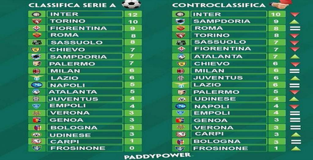 Paddy Power ha pubblicato la propria ‘controclassifica‘, la classifica senza errori arbitrali di Serie A. In testa troviamo sempre l’Inter che però avrebbe due punti in meno rispetto ai dodici conquistati fino ad ora. Al secondo posto, invece del Torino, troviamo la Sampdoria, una delle squadre più penalizzate del torneo fino ad ora. Sorriderebbe di più anche il Frosinone, che potrebbe vantare un punto rispetto allo zero totalizzato fino ad ora.