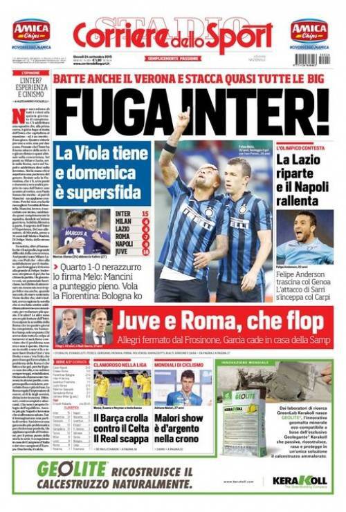 Il Corriere dello Sport parla già di fuga Inter alla quinta giornata di campionato ma la Fiorentina è a tre punti dai nerazzurri.