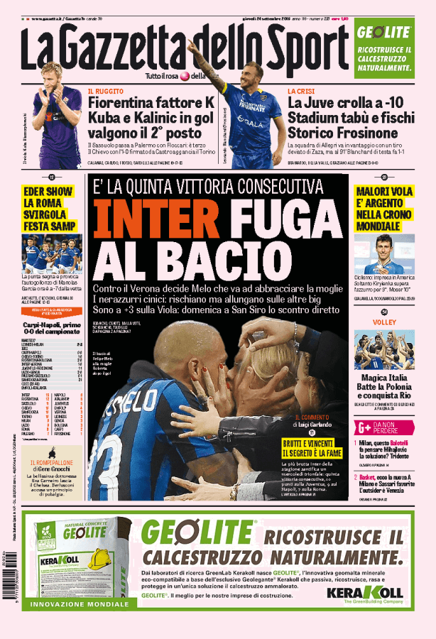 La Gazzetta dello Sport parla dell’Inter di Mancini che vince il quinto match consecutivo grazie al gol di Felipe Melo.