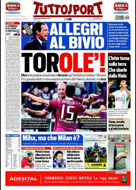 Su Tuttosport si parla del Torino che vince due a uno contro il Palermo e vola al secondo posto in classifica.