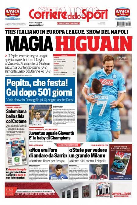 Il Corriere dello Sport rende merito al Napoli che ha vinto due a zero sul campo del Legia Varsavia con un gol stratosferico di Higuain.
