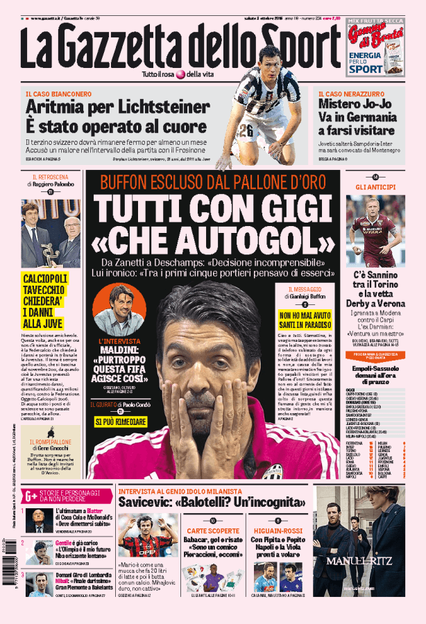 Gazzetta dello Sport – Tutti con Gigi ‘Che autogol’ 03/10/2015 di Ruggieri La Gazzetta dello Sport parla della situazione di Buffon escluso dal Pallone d’Oro. Tante reazioni a favore del portiere bianconero. Samuele Roccati