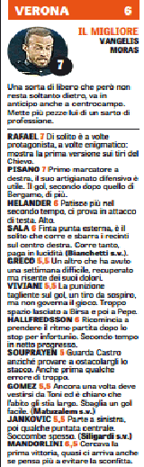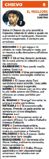 E’ finito 1-1 il derby di Verona tra Chievo ed Hellas. Un risultato che fa restare nelle zone alte della classifica il Chievo e fa respirare la squadra di Mandorlini. Nel Chievo, il migliore per la Gazzetta dello Sport è stato Castro che salva la propria squadra da una sconfitta ingiusta volando in cielo e va quasi a prendersi il raddoppio. Nell’Hellas, invece, il migliore è stato Moras che gioca come una sorta di libero. Mette più pezze lui che un sarto di professione.