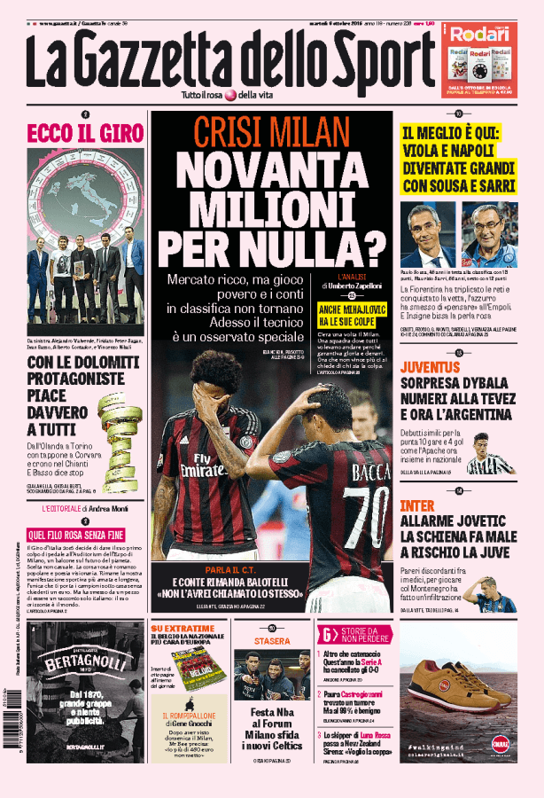 La Gazzetta dello Sport parla del Milan che ha speso 90 milioni di euro ma non è ancora protagonista in Italia.