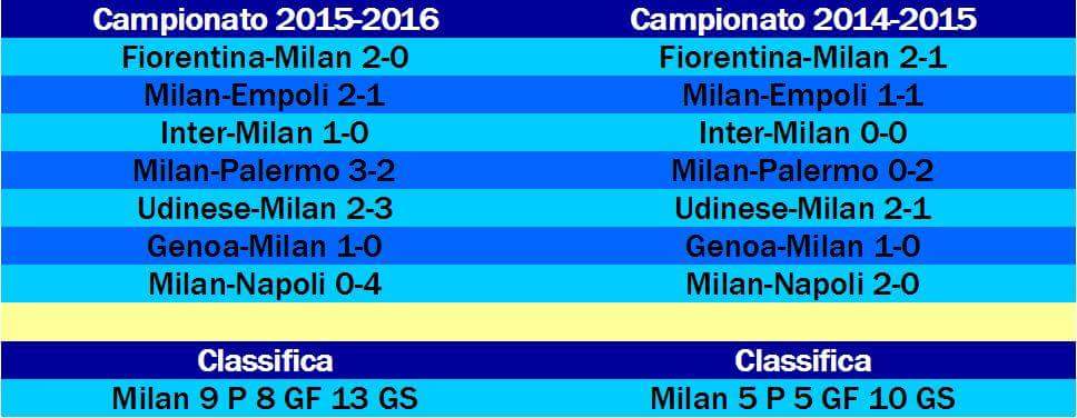 Per il terzo anno consecutivo è già crisi per il Milan dopo poche giornate di campionato. Quattro sconfitte in sette partite hanno già messo a repentaglio la posizione di Sinisa Mihajlovic che a livello di punti ha fatto peggio del suo predecessore Filippo Inzaghi. Secondo una statistica raccolta dalla redazione di Calciomercatonews.com però, il tecnico serbo avrebbe raccolto più punti dell’ex numero 9 nelle sfide contro le stesse squadre affrontate. I rossoneri infatti hanno perso a Genova sia lo scorso anno che questo, così come a Firenze. A fronte delle sconfitte di Udine e in casa contro il Palermo sono arrivati però due successi, mentre contro l’Empoli, battuto quest’anno per 2-1, l’anno scorso arrivò un pari. Peggio è stato fatto con il Napoli contro il quale nel 2014/2015 arrivò un successo. Ovviamente i risultati conseguiti sono arrivati in diversi momenti della stagione passata quando il club meneghino era già in caduta libera dopo un discreto avvio di stagione. Si tratta infatti di un’analisi statistica che va valutata quanto tale.