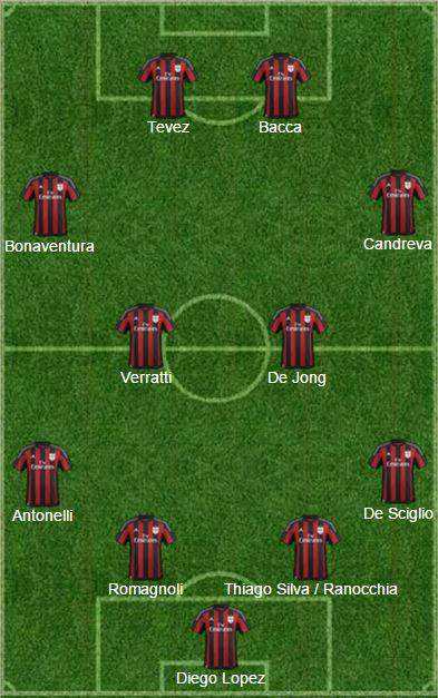 Possibile inanto l’utilizzo del 4-2-4, modulo che a Siena prima ed a Torino poi, fece porre le basi per stagioni vincenti. In difesa, insieme ai confermati Diego Lopez, De Sciglio, Romagnoli ed Antonelli, graditissimo ritorno a Milano: Thiago Silva, che mai ha nascosto la voglia di chiudere la carriera in rossonero, potrebbe sbarcare nuovamente a Malpensa, per cercare di riportare il tricolore a Casa Milan. A questi potrebbe inoltre essere aggiunto il nerazzurro Ranocchia, pupillo di Conte che tanta voglia ha di rimettersi in gioco dopo il fallimento in nerazzurro. Due grandi innesti sulla mediana: i due titolarissimi in Nazionale, Candreva e Verratti, verrebbero chiamati a rimpolpare un centrocampo che negli ultimi anni ha dato più preoccupazioni che soddisfazioni. Attacco tutto sud americano con il colombiano Bacca affiancato dal sopra citato Carlitos Tevez.