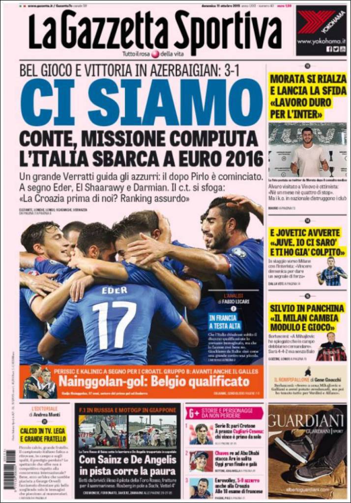 Conte, missione compiuta: l’Italia sbarca ad Euro 2016. Un grande Verratti guida gli Azzurri. Il dopo Pirlo è cominciato. Morata si rialza e punta l’Inter. E Jovetic avverte: “Juve, ci sarò”.