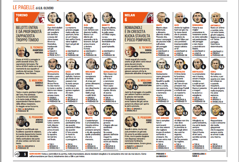 E’ finito 1-1 l’anticipo dell’ottava giornata di Serie A tra Torino e Milan. Al vantaggio iniziale di Bacca ha risposto Baselli, vero cuore granata. Eì proprio lui il migliore del Toro nei voti e nelle pagelle della Gazzetta dello Sport. gestisce il gioco, poi comincia ad inserirsi con continuità e fa tanto male al Milan. Tra i rossoneri, invece, il voto più alto va a Bonaventura che il coraggio e la qualità per saltare l’uomo e cercare la giocata mai banale. Il peggiore dei rossoneri, invece, è Diego Lopez che si fa sorprendere da Baselli.