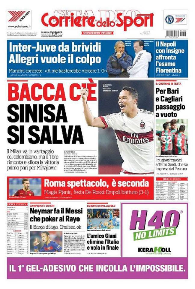 Il Milan va in vantaggio col colombiano ma il Toro rimonta e sfiore la vittoria. Roma spettacolo, è seconda. Inter-Juve da brividi, Allegri vuole il colpo.