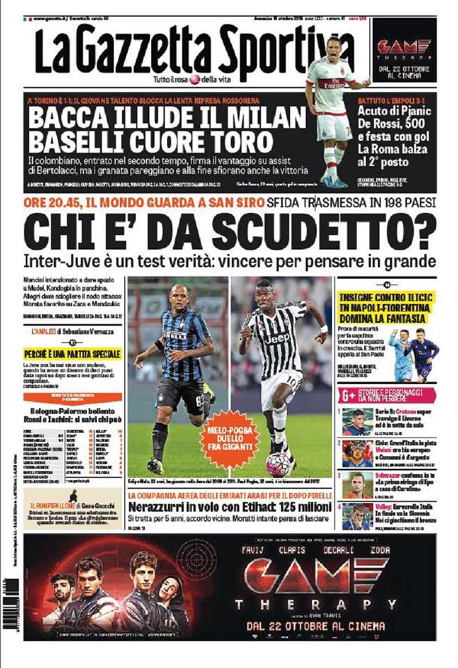 Inter-Juve, è un test verità. Vincere per pensare in grande. Bacca illude il Milan. Baselli cuore d’oro. Acuto di Pjanic, De Rossi 500 e festa gol. La Roma balza al secondo posto.