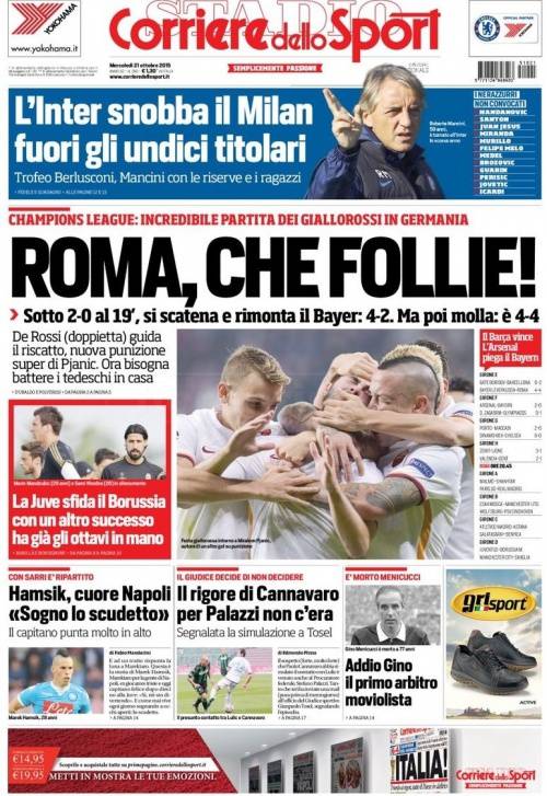 Il Corriere dello Sport parla della Roma che compie un’autentica follia contro il Bayer Leverkusen pareggiando quattro a quattro.