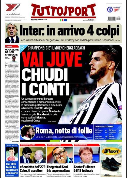 Su Tuttosport si parla della Juventus che contro il Borussia Moenchengladbach vuole chiudere i conti nel girone.