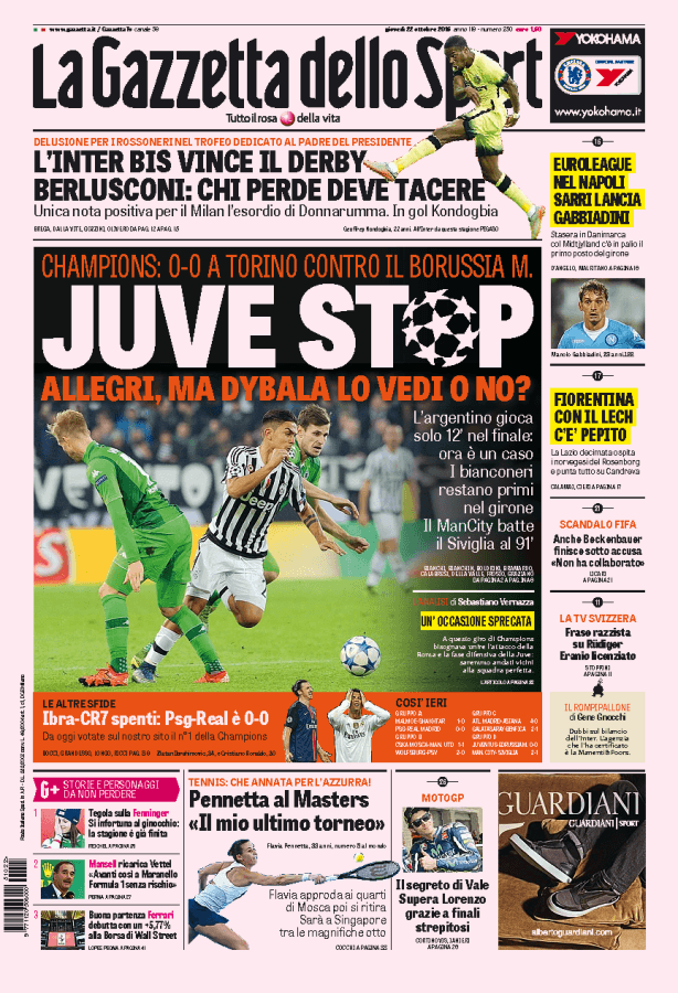 La Gazzetta dello Sport parla della Juventus che pareggia zero a zero contro il Borussia M. e critica l’allenatore che non vede Dybala.