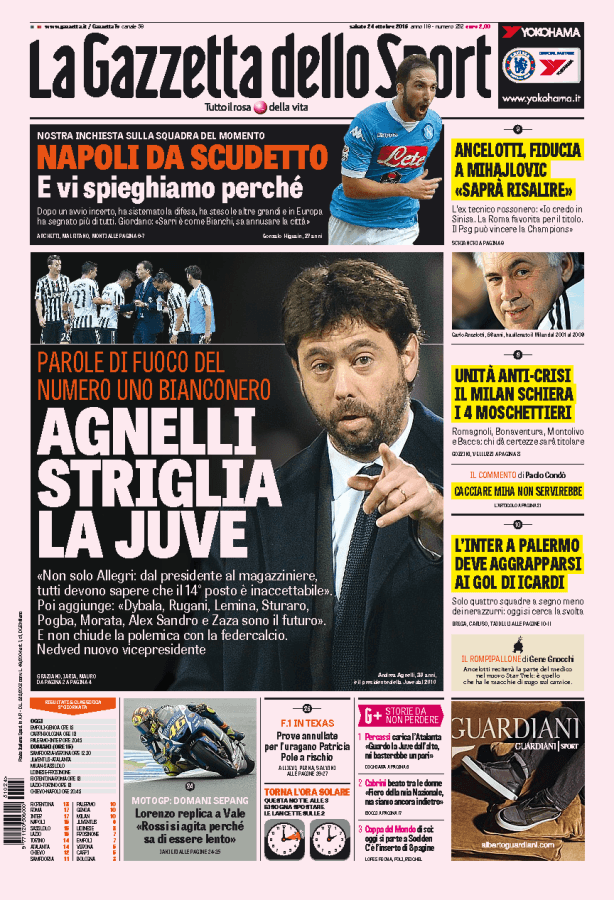 La Gazzetta dello Sport parla delle parole di Agnelli che ha strigliato la Juventus durante il Cda bianconero.