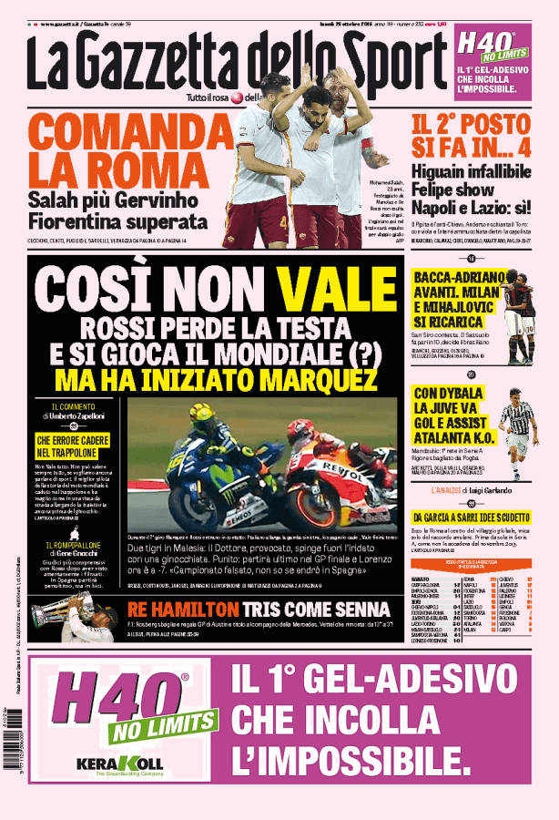 La Gazzetta dello Sport parla della Roma che vince contro la Fiorentina per due a uno e vola in testa alla classifica.