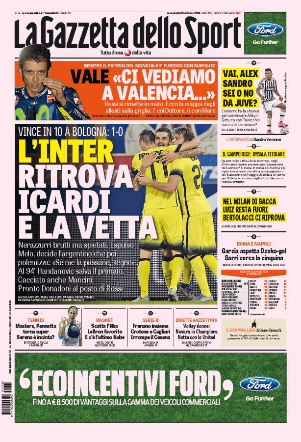 La Gazzetta dello Sport parla dell’Inter che vince in dieci a Bologna per uno a zero con il gol di Maurito Icardi.