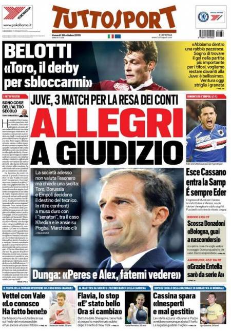 Su Tuttosport si parla di Allegri che è sotto-esame dopo il k.o. subito a Sassuolo per uno a zero. Dovrà rimediare contro il Torino o rischierà tanto.