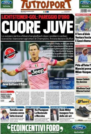 Anche Tuttosport parla ovviamente della Juventus che pareggia in casa del Borussia M. con il gol di Lichtsteiner.