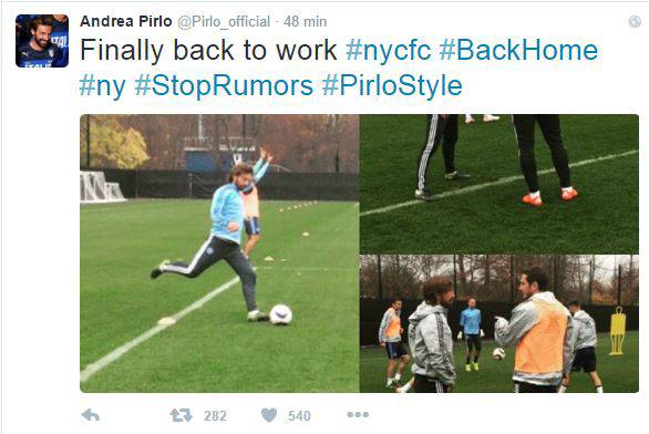 E’ il candidato numero uno per vestire la maglia dell’Inter a gennaio, ma – almeno al momento – non vuole saperne. Andrea Pirlo, tornato ad allenarsi quest’oggi con i New York City Fc, come testimoniato dalle foto caricate sul suo profilo Twitter. A catturare l’attenzione è l’hashtag #StopRumors, quasi un chiaro riferimento alle voci di mercato che continuano a susseguirsi negli ultimi giorni.