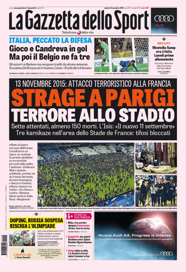 La Gazzetta dello Sport parla dell’orrore a Parigi con gli attentati terroristici che hanno portato alla morte di più di 100 uomini.