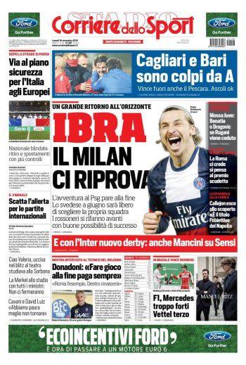 Il Corriere dello Sport parla di Ibrahimovic con il Milan pronto a riprendere il calciatore che è in scadenza con il Psg.
