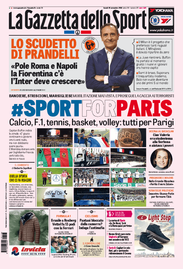 La Gazzetta dello Sport parla dei tanti gesti dello sport italiano nei confronti delle vittime degli attentati di Parigi.