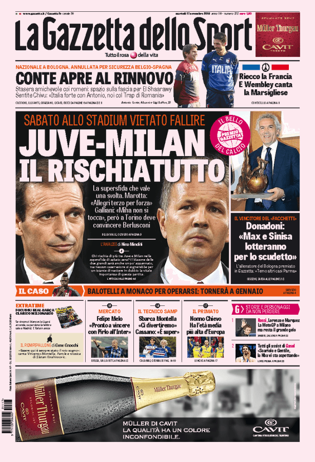 La Gazzetta dello Sport parla di Juventus-Milan di sabato sera, chi perde rischia davvero di ricevere tante critiche.