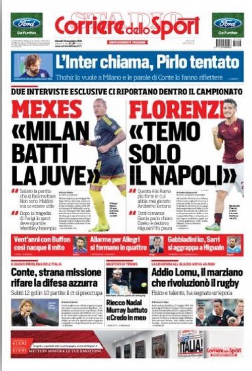 Il Corriere dello Sport propone due interviste esclusive a Mexes e Florenzi che parlano del campionato. Il romanista teme solo il Napoli nella corsa Scudetto.