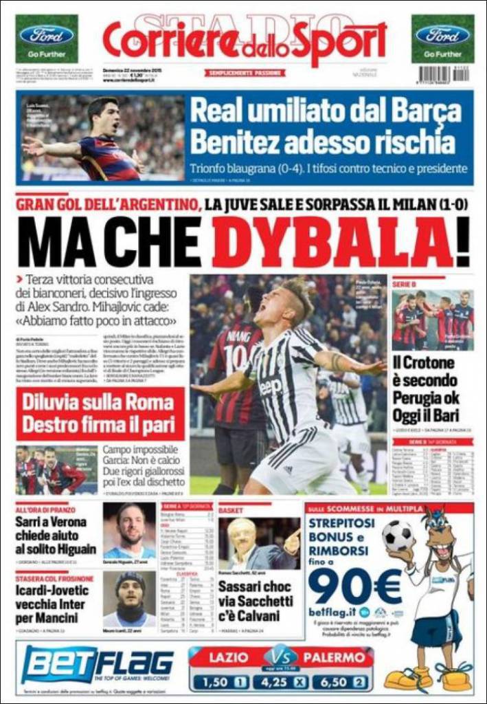 Terza vittoria consecutiva dei bianconeri. Decisivo l’ingresso di Alex Sandro. Mihajlovic: “Abbiamo fatto poco in attacco”. Real umiliano dal Barca. Benitez ora rischia. Diluvia sulla Roma. Destro firma il pari.