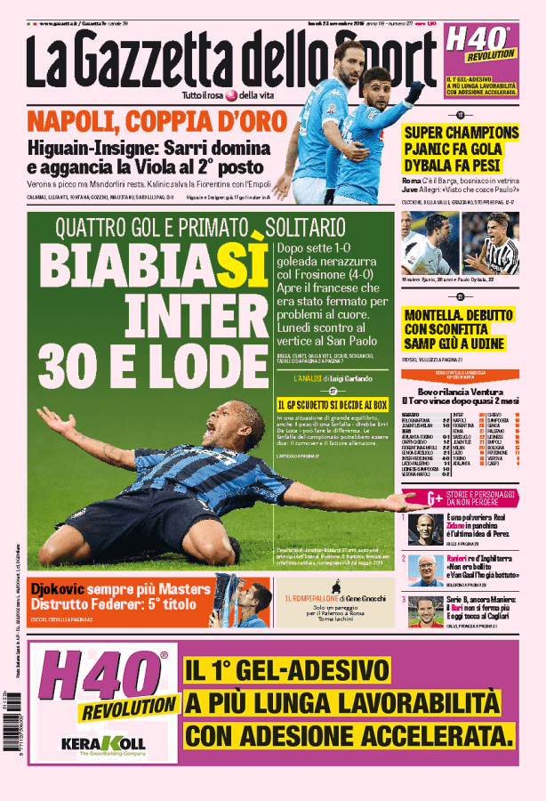 La Gazzetta dello Sport parla dell’Inter che vince quattro a zero contro il Frosinone. In gol anche Biabiany.