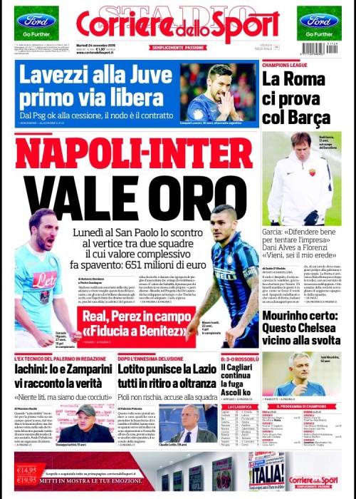 Il Corriere dello Sport parla di Napoli-Inter di lunedì sera che vale tanto visto il valore delle due rose.