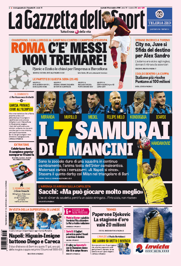 La Gazzetta dello Sport parla dei sette giocatori dell’Inter che rappresentano lo zoccolo duro di Mancini.