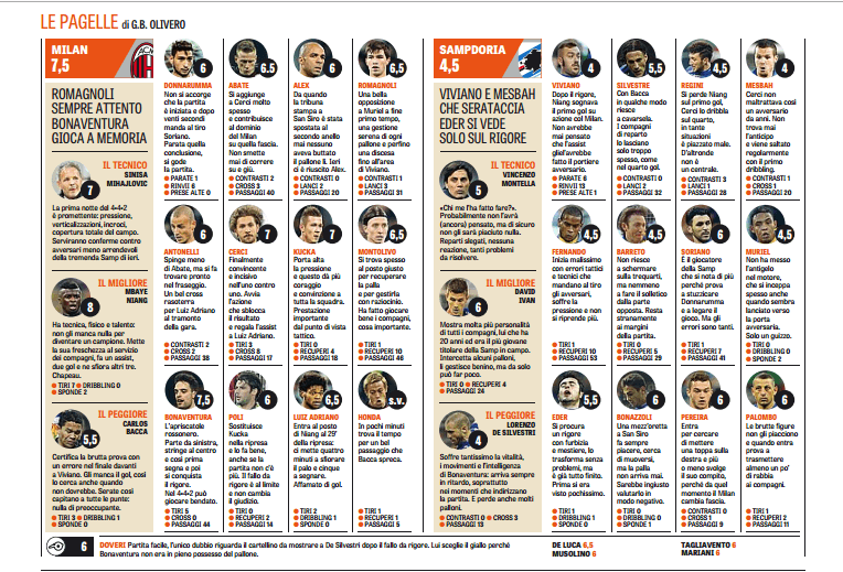 Grande e netta vittoria del Milan sulla Sampdoria grazie ad uno straordinario Niang, in assoluto il migliore anche nei voti e nelle pagelle della Gazzetta dello Sport. Ha tecnica, fisico e talento per diventare un grande campione. Mette la sua freschezza al servizio dei compagni e segna anche due gol. Rimandato, invece, Bacca in una serata negativa ma nulla di preoccupante. Nella Sampdoria serata da incubo per De Silvestri che soffre tantissimo la vivacità di Bonaventura.