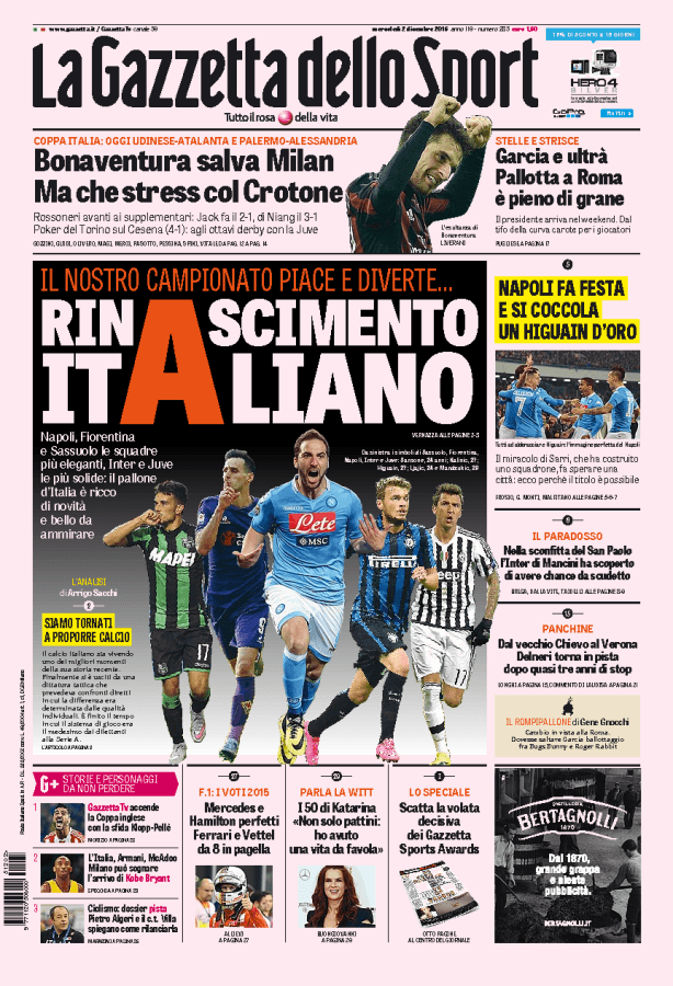 La Gazzetta dello Sport parla della Serie A che è tornata ad essere un campionato di grande livello e bello da vedere.