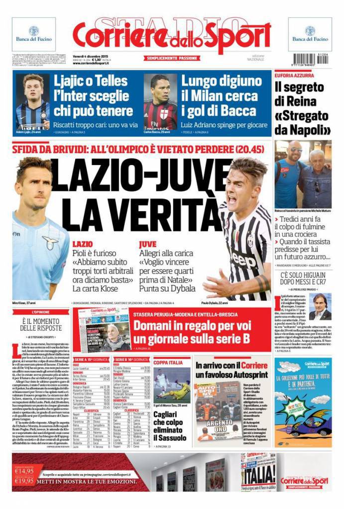 Il Corriere dello Sport parla di Lazio-Juventus di questa sera con due squadre alla ricerca della vittoria.