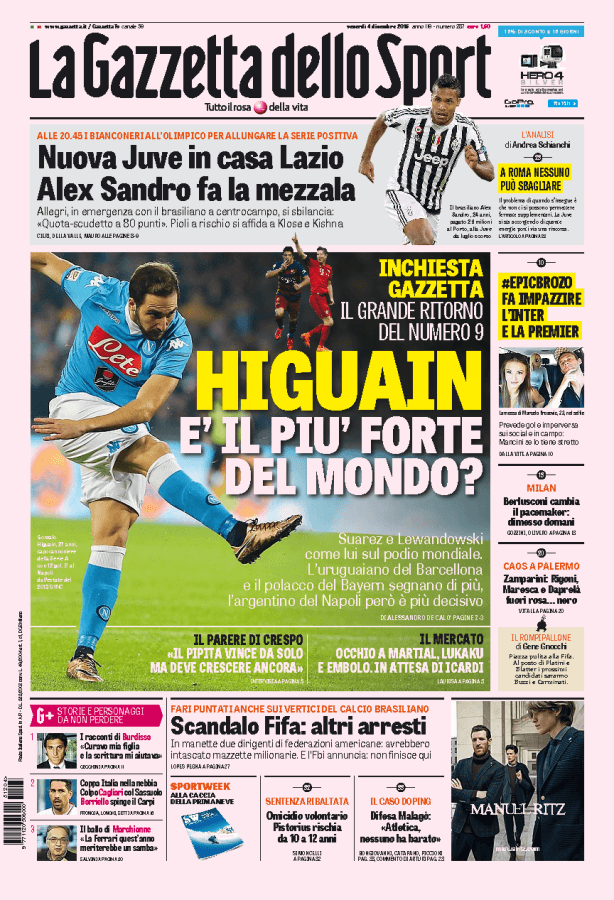 La Gazzetta dello Sport parla di Higuain come il centravanti più forte del Mondo assieme a Suarez e Lewandowski.