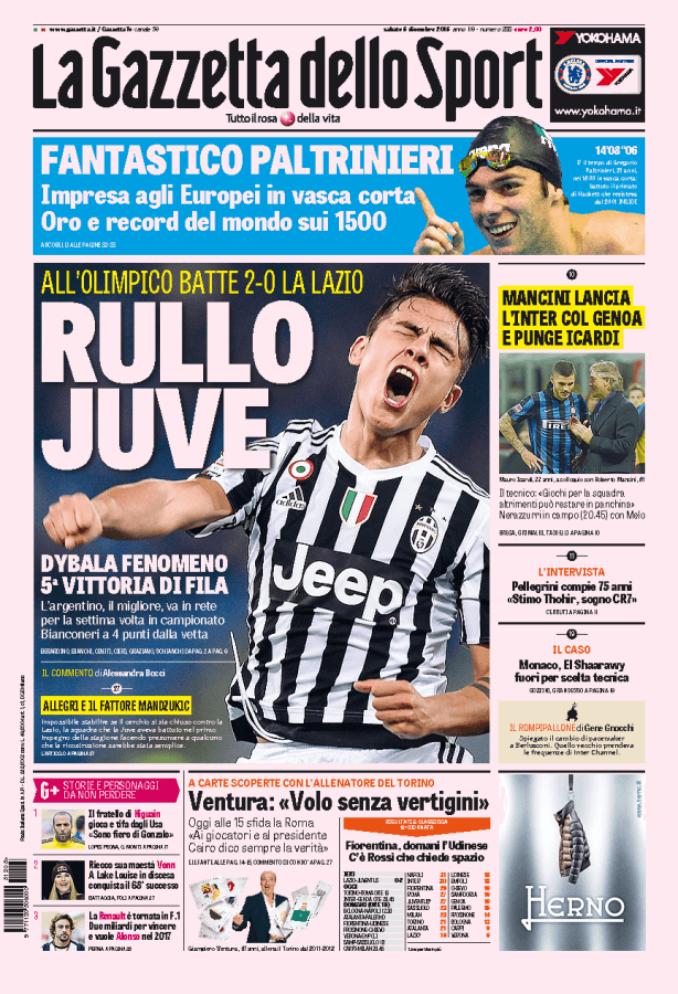 La Gazzetta dello Sport parla della Juventus che vince due a zero in casa della Lazio e torna nelle zone alte della classifica.