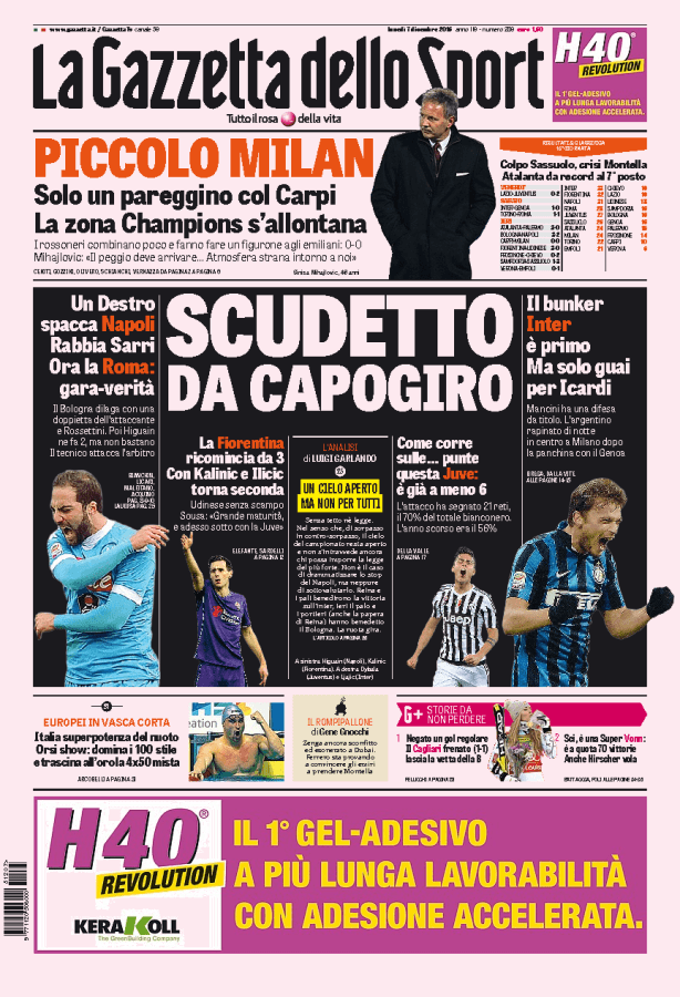 La Gazzetta dello Sport parla della lotta Scudetto che vede nuovamente l’Inter in testa alla classifica dopo il k.o. del Napoli.